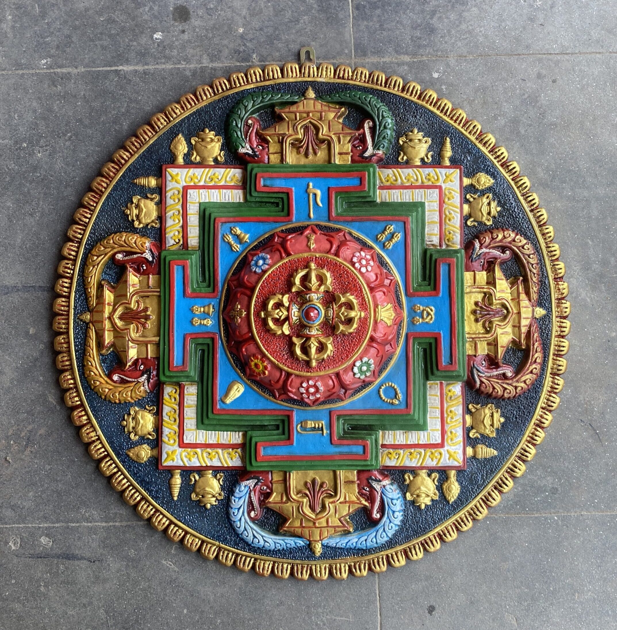 A powerful sacred mandala centered around the Vajra (Bajra), symbolizing strength, protection, and indestructible energy. The vajra represents the power of enlightenment—strong like a diamond and powerful like thunder. This mandala is often used in Buddhist practices to create a shield against negative energies while promoting clarity and spiritual strength.